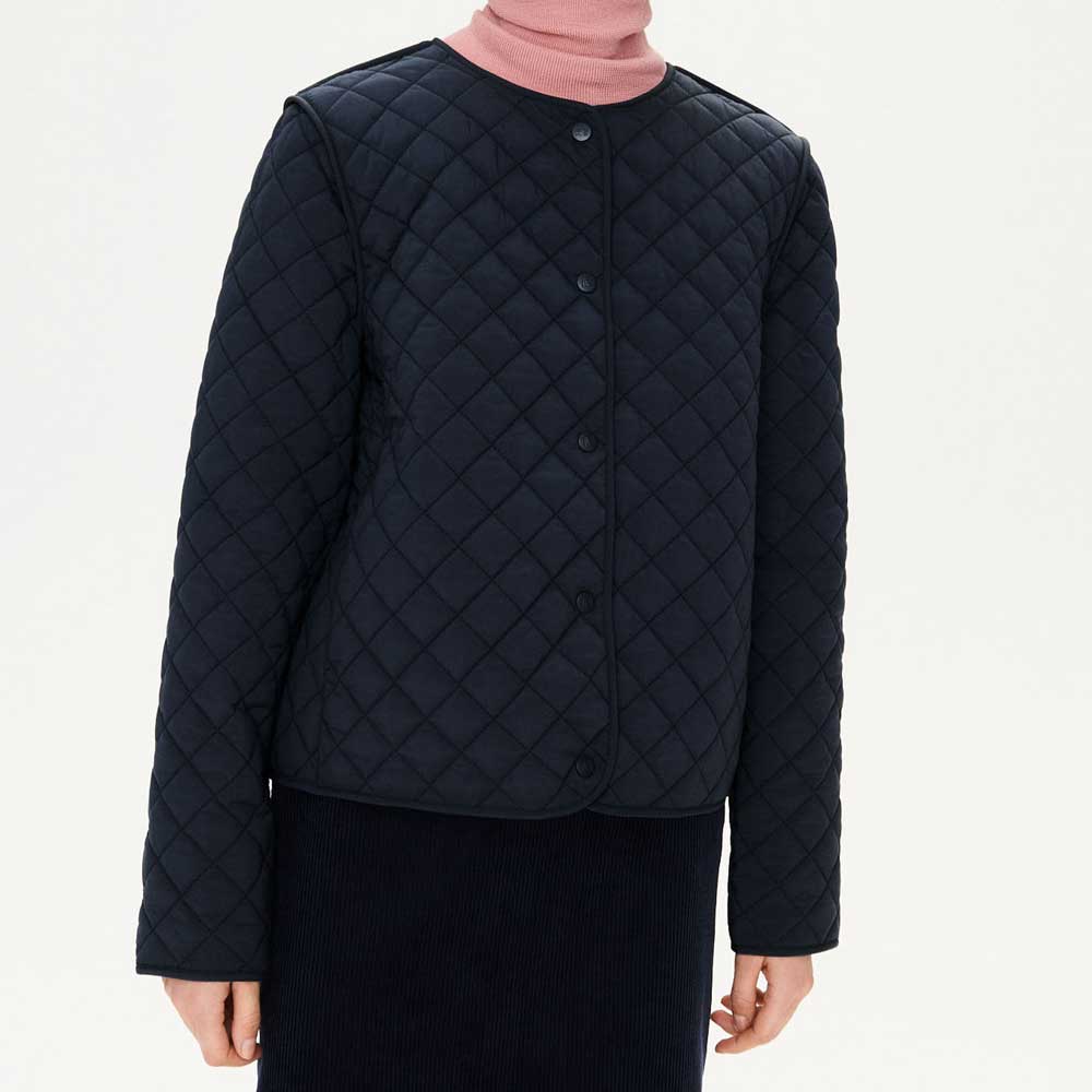 張り感があり撥水性に優れたナイロン×ポリウレタンの混紡素材を使用した、ダイヤモンドキルティングのショート丈ジャケットです。アウターに干渉しない首元のデザインで、インナーとしても使用できます。 |