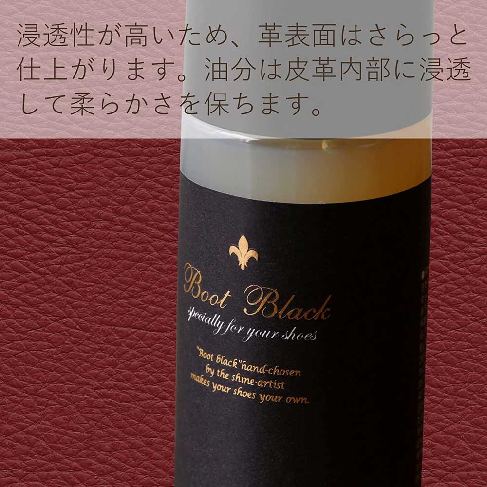 Boot Blackシリーズの中で最も汎用性が高い万能なクリームです。皮革製品全般に使用でき、デリケートな革にもご使用頂けます。新たに購入した革製品のプレメンテナンスにもおすすめです。栄養や光沢をバランスよく与えます。 |