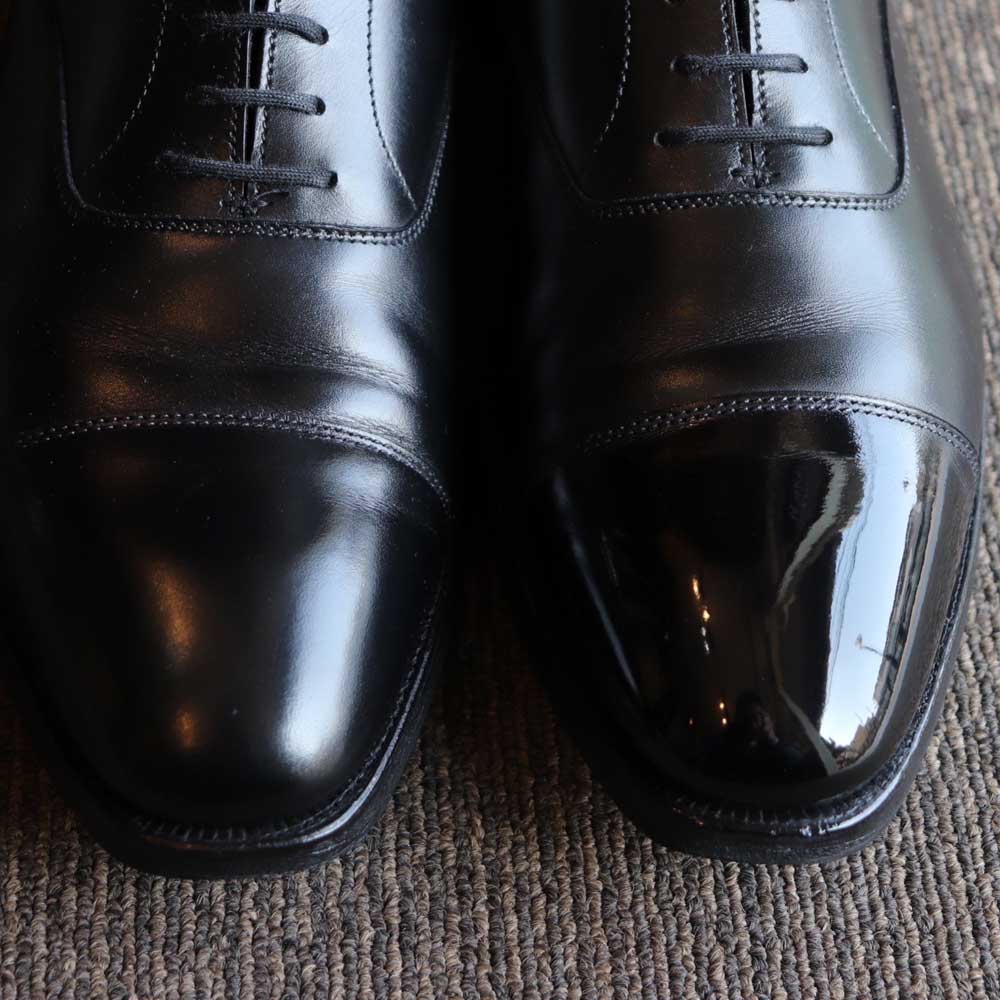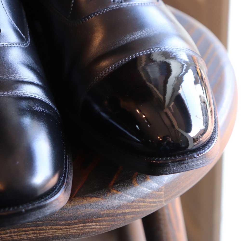 靴のつま先を光らせることによって、その表情や存在感をワンランク上の仕上がりにすることができるハイシャイン(鏡面磨き)。つま先に自分の顔が映るほどの光沢・透明感を持たせることが可能ですが、技術的な難易度は非常に高く、「なかなか上手く光らない」、「失敗して革の表面が荒れてしまった」という経験がある方も多いはず。また、ハイシャインは熟練のシューシャイナーでも時間のかかる作業でもあり、プロの世界でも「より透明感や平滑性の高い磨きの技術」が模索されているジャンルです。M.Mowbrayのテクニカルアドバイザーを務める斗谷氏が独自で開発に着手し、光学的な視点で「鏡面膜の内外の光の挙動」を考慮しながら、材料を最適化して実現したハイシャイン(鏡面磨き)仕上げ用ワックスです。 |