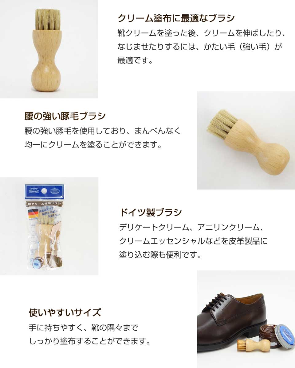 【布よりブラシが優れている理由】 ・ブラシの方がクリームを全体的にまんべんなく 伸ばしやすい。 ・手を汚さずに効率的に作業ができる。 ・コバの部分やメダリオン、革のシボ(シワ) など布では届かない部分までクリームを塗り、 詰らない様にかき出す事ができる。 【使い方】 クリームを米粒で3、4粒分程度ブラシに取り、 靴に薄く広げていきます。スピーディーにクリ ームを全体に広げながら、コバの部分もしっか りとクリームを塗りこむ要領で浸透させます。 毛の種類:豚毛 用途:皮革製品、革小物専用塗布ブラシ サイズ:7cm 毛の長さ約2cm 生産国:ドイツ ※ブラシの毛先についたクリームで毛が固まった 場合は水またはぬるま湯で洗い流してください。 木の部分に水やぬるま湯をつけると木が割れる 場合があります。 |