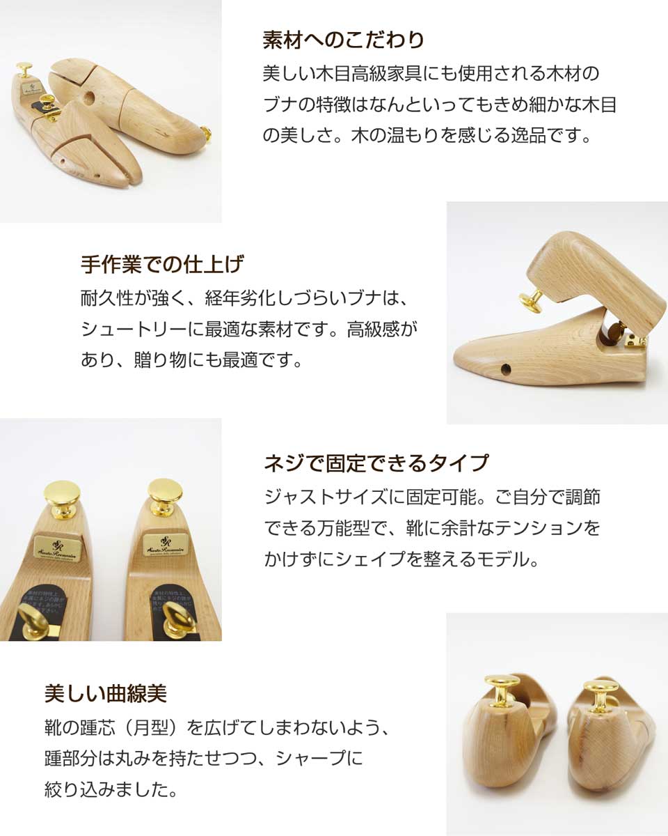 | 幅は標準で、甲部にハリを出すやや高い形状。 材質はブナ、ニス仕上げ、ほのかな天然木の香りがします。 |