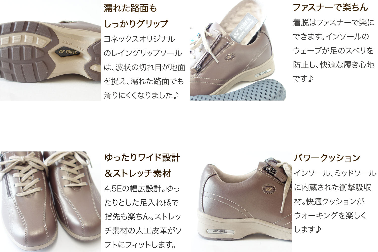ヨネックスならではの機能性 疲れにくいパワークッションを搭載! 歩くのが楽しくなるお洒落なスニーカータイプ ゆったり4.5Eワイド設計モデル ストレッチPUで楽々フィット♪ |